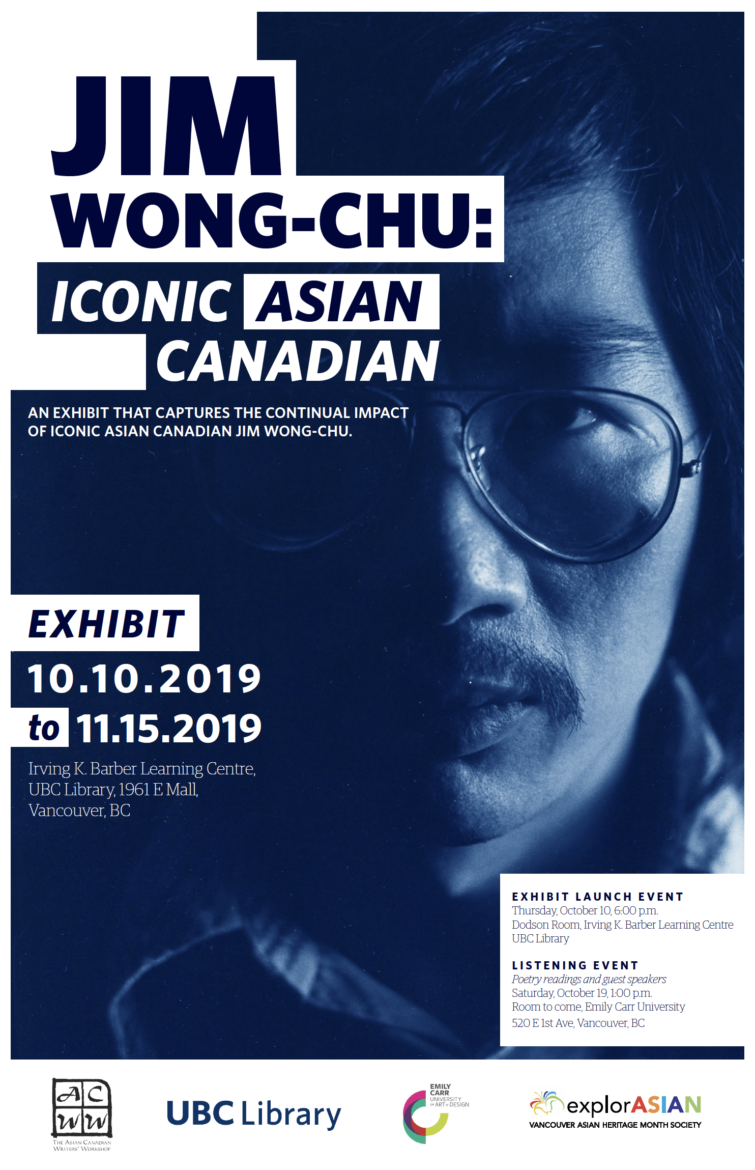 UBC Library’s Rare Books and Special Collections, Emily Carr University of Art + Design, The Vancouver Asian Heritage Month Society and the Asian Canadian Writers Workshop have collaborated to present an exhibition that captures the continual impact of the iconic Asian-Canadian, Jim Wong Chu. I was the creative lead for producing the distributable print poster, social media and digital signage for promotions. The exhibit ran from October to November 2019 at Irving K. Barber Learning Centre.